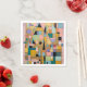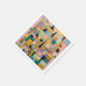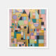 This abstract composition is a sophisticated interplay of geometric shapes and architectural forms, rendered in a harmonious palette of dusty rose, mustard gold, and muted teals. The piece features an intricate grid of squares, circles, and sharp triangles that suggest a fragmented cityscape or a complex mechanical blueprint. Large areas of textured gold leaf provide a luxurious backdrop to the floating circles and intersecting black lines, which create a sense of balanced tension and mathematical rhythm. The overall effect is a blend of mid-century modernism and playful abstraction, framed by a soft lavender border.