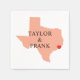 A forma do mapa do Peach do estado do Texas... a cor é personalizável para combinar com a paleta de cores do casamento. Personalize a cor vermelha do coração e mova o gráfico vetorial para o local do casamento na forma do mapa. Personalize o elegante estilo de texto moderno para criar seus próprios guardanapos de recepção de casamento personalizados.