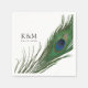 Um conjunto único de guardanapos de papel para o seu elegante evento de casamento. Ele apresenta uma imagem de uma elegante pena de pavão em direção ao lado. Do lado oposto disto estão as iniciais da noiva e do noivo e a data de casamento ou noivado.