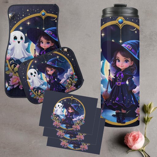 Pequena bruxa com olhos grandes e brilhantes. Ao lado dela bota um fantasma fofo que parece amigável e tem uma aura divertida. A design transmite um sentimento de amizade e magia