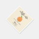 Pequeno tema bonito, chá de fraldas, guardanapo de papel amarelo, apresentando uma ilustração de uma folha verde e laranja tangerina com um sorriso fofo e bochechas cor-de-rosa. O texto diz "um pouco de graça está a caminho!" Excelente de um chá neutro em termos de gênero.