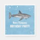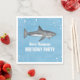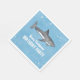 Este design bonito apresenta uma simples decoração de festas de animais azuis, um oceano de água de festas de piscina, com peixe-maria de cor aquática, um guardanapo de papel personalizado azul, uma bebida de bebida de cocktail, com vida marinha selvagem náutica, com tubarões cinzas marinhas pretas, um divertido piquenique festivo, excelente para a festa de natação de natação no verão, para a festa de aniversário de criança de verão no quintal