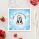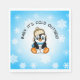 Uma mão bonita desenhou pinguim bebê no cachecol e chapéu com fundo de floco de neve. Bonito para um chá de fraldas temático de inverno ou uma festa de Natal. Texto sobre guardanapos pode ser editado na área de personalização.