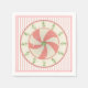 Estes guardanapos de papel apresentam um encantador começo de design original com um fundo riscado rosa e branco onde uma coroa flutuante de árvores de Natal em ziguezague ao redor de um medalhão central de um doce picante estilo pinWheel. Tem uma sensação retrógrada entre 1940 e 1950 devido a tons desbotados de vermelho e verde e efeito 'granulado'.