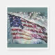 Esta imagem de bandeira americana, é destacada contra, fogos de artifício que explodem, numa exibição colorida de, vermelho, branco, azul e amarelo, flares em um céu nublado e crepúsculo, de azul ardente.