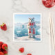 Urso polar vestindo um cachecol listrado vermelho e branco sobre uma paisagem gelada, segurando suas patas em forma de coração