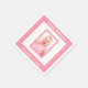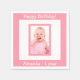 Um guardanapo para uma festa de primeiro aniversario de menina fofa. Fundo branco e cor-de-rosa, quadro e modelo cor-de-rosa para a sua própria foto da aniversariante. Letras cor-de-rosa e texto: Feliz Aniversário! Modelo de nome e idade 1-