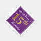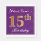 Este simples e elegante design de guardanapo de papel apresenta uma mensagem como "Aniversário do 15 do Primeiro Nome" (com o "15" a ter uma coloração falsa em ouro) dentro de uma área quadrada de cor púrpura com um contorno de fronteira simples. O nome está em um texto semelhante a script de cor branca e pode ser personalizado. Napkins como estes poderia talvez ser usado numa festa de aniversário para alguém que comemora seu décimo quinto aniversário. [~Z0000140]
