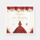Este elegante e glamouroso guardanapo de festa de aniversário apresenta uma bela princesa com cabelo vermelho-marrom e pele clara em um vestido de bola vermelha. O texto combina o script manuscrito e as fontes sans serif modernas para um aspecto elegante e sofisticado. Os arranjos florais, borboletas e confete de ouro criam a mistura perfeita de rústicos e quicos. Gráficos por www.etsy.com/uk/shop/SunflowerDayLove