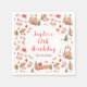 This elegant and festive napkin features a watercolor gingerbread house, gingerbread train, cake stand, cookie jar, hot cocoa, red poinsettia flowers and Christmas trees. The text combines handwritten script and sans serif fonts for a stylish and modern look. This is perfect for Christmas birthday parties.