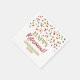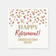 Feliz guardanapo de aposentadoria com padrão de confete vermelho e dourado.