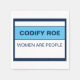 Codifique que as mulheres rosas são Pessoas. Codificar Roe deveria ser o cerne dos direitos das mulheres em matéria de saúde, não o teto. E agora mesmo isso não existe. Diga ao Congresso que é hora de eles fazerem o mínimo que podem fazer pela saúde, segurança e igualdade das mulheres, porque as mulheres são pessoas, e aborto, qualquer que seja a razão, é assistência médica. Descrição do design: O espaço do design é um fundo branco com uma borda azul escura. Na metade superior do espaço design, as palavras "Codificar Roe" em uma fonte serif azul escura. Por baixo disso, uma larga faixa azul clara com bordas superiores e inferiores azuis escuras. Abaixo da faixa, na metade inferior da design, as palavras, "As mulheres são pessoas."