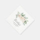 Os guardanapos personalizados fazem seu 19º decoro de mesa especial. As rosas brancas estão aninhadas em folhas verdes de eucalipto.