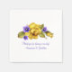 Elegantes rosas amarelas pontilhadas com violetas roxas em guardanapos num fundo branco. Personalize com o seu próprio texto.