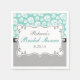 Este guardanapo de papel do chá de panela apresenta rosas brancas sobre um fundo aqua na metade superior e uma cinza de luz na parte inferior. Um quadro branco giro com borda preta no centro apresenta texto personalizável para você adicionar o nome da noiva e a data do chá de panela.