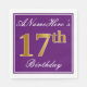 Este simples e elegante design de guardanapo de papel apresenta uma mensagem como "ANameHere's 17th Birthday" (com o "17º" com uma falsa coloração em forma de ouro) dentro de uma área quadrada de cor roxa com um contorno de fronteira simples. O nome está em um texto semelhante a script de cor branca e pode ser personalizado. Napkins como estes poderia talvez ser usado numa festa de aniversário para alguém que comemora seu 17º aniversário. [~Z0000140]
