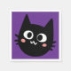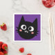 Um guardanapo roxo engraçado com um gato preto de desenho cômico com grandes olhos redondos e bochechas rosa rosadas num estilo de arte de desenho de rabisco.