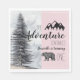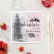 A aventura aguarda, florestas rústicas carregam guardanapos de primeiro aniversario rosa-menina em uma matiz rosa-pastel macia, com uma majestosa árvore-pinheiro-da-floresta e silhueta-da-montanha. Personalize para sua celebração.