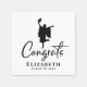 Sinapos brancos e pretos personalizados para a sua festa de festa de formatura com uma ilustração da silhueta de uma formando fêmea celebrando em seu boné e vestido, "Parabéns" em um roteiro de na moda e seu nome e ano de aula em uma simples tipografia.