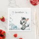Cute baby shower or birthday paper napkin featuring adorable little male zebra sitting on the clouds with some blue love hearts