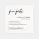Crie uma experiência única e envolvente para seus convidados de casamento com nossos Simples Fatos de Brancos Negros e Brancos de Napkins. Perfeito para recepções, horas de coquetel ou jantas de ensaio, esses guardanapos combinam um design preto-e-branco minimalista com fatos divertidos personalizados sobre o casal. Projetados para complementar uma variedade de temas de casamento, do moderno ao elegante, esses guardanapos adicionam um elemento pessoal e interativo à sua celebração. Aprecie seus hóspedes com peitos interessantes enquanto melhora a estética geral de seu dia especial. Personalizável e na moda, eles são um detalhe pensativo para qualquer evento de casamento.