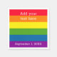 Este design apresenta listras vermelhas, laranja, amarelas, azuis, verdes e roxas — as cores do Orgulho gay Flag Use estes guardanapos em uma festa de saída ou qualquer outro evento de Orgulho gay ou LGBTQ. As áreas de modelo são fornecidas para que você personalize com o nome e a data do evento.