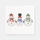 Três bonitinhos bonitos homens de neve vestindo lenços e cada um com uma roupa especial decorada. Um chapéu de Papai Noel, um gorro e um chapéu.