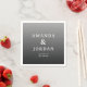 This wedding napkin design features a minimalist layout with a gradient background transitioning from light to dark gray, creating a sophisticated and modern look. The clean serif typography adds an elegant touch, prominently displaying the names in bold letters while allowing for customizable placeholders for location and date. The overall style is understated yet refined, perfect for formal celebrations that value both tradition and contemporary aesthetics. Its calm and composed mood makes it ideal for weddings or other special occasions where elegance and clarity are key.