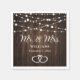 Decorem a vossa festa de casamento rústica com o Sr. e a Sra. guardanapos de papel de casamento, com corações entrelaçados contra um fundo de madeira rústica adornada com um elegante lugar floral e luzes de cordas.