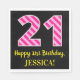 Este divertido design de guardanapo de papel, tema de aniversário, apresenta um grande número de "21" com uma rosa claro e um padrão de listras cor-de-rosa-escuro, juntamente com a mensagem "Happy aniversário de 21 anos", e um nome personalizado. O fundo é preto colorido. Os guardanapos de papel com tema de aniversário como este podem ser divertidos de usar numa festa que está a ser realizada para celebrar o aniversário de 21 anos de alguém. [~Z0000380]