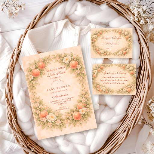 This romantic peach garden collection features soft watercolor peaches, blush florals, and delicate ribbon bows arranged in an elegant vintage-style frame. The warm pastel palette and airy botanical details create a timeless, feminine look that feels both sweet and refined. Perfect for a peach-themed celebration, this design pairs beautifully with garden, cottage, and storybook-inspired baby showers.