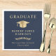 Guardanapos elegantes para festa de formatura azul escuro com tampa de graduado dourada, "Graduado" e o nome do graduado, escola e ano de conclusão em tipografia clássica serif.
