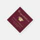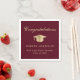 Guardanapos elegantes de festa de formatura em vermelho burgundy com uma tampa de graduação dourada, "Parabéns" em uma fonte de caligrafia clássica e o nome do formando, escola e ano de formatura em tipografia moderna.