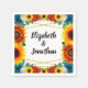 Design floral elegante e colorido para um evento de verão no quintal. Apresenta rosas azuis, margaridas brancas, flores silvestres vermelhas e girassóis com quadro geométrico dourado