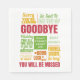 Diga adeus no estilo. Este fabuloso design de tipografia apresenta várias mensagens de despedida. Um guardanapo maravilhoso para enviar seus melhores desejos e decorar uma mesa de festa. Seria perfeito para a festa de saída de um funcionário ou colega de escritório. Pode ser personalizado com uma mensagem curta.