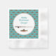 Guardanapos de papel para festa de aposentadoria de pesca com texto. Imagens de trutas e de vara e carretel decoram guardanapos que vêm em muitos tamanhos e estilos. Personalize com letras grandes no topo dizendo "Feliz aposentadoria (nome)". Uma imagem de vara e carretel e uma imagem de truta são impressas abaixo da escrita. A borda é um padrão de trutas pintadas nadando sobre um fundo turquesa. Temos pratos de papel para combinar.