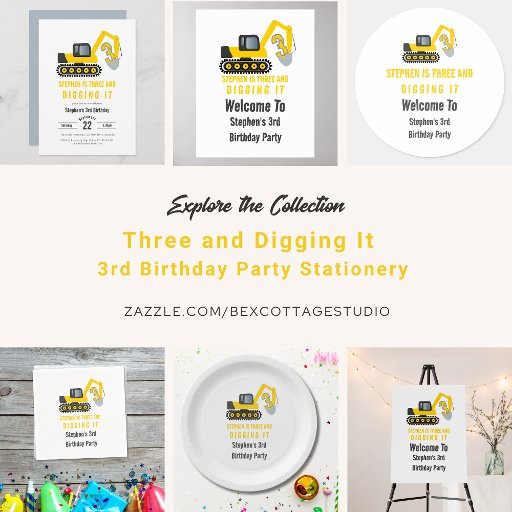 Celebre o grande dia do seu pequeno construtor com esta divertida coleção de artigos de papelaria com tema de construção! Perfeito para uma festa de aniversário de 3 anos, o design apresenta um duro amarelo brilhante no trabalho com a frase lúdica "três e cavando." Ideal para crianças que adoram caminhões e estaleiros de construção. Uma forma excelente de dar o tom para uma comemoração cheia de diversão!