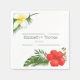 Wedding paper napkins featuring lush tropical foliage and beautiful floral accents in bright red, yellow and white. Use the provided template to customize your names and wedding date. Search ID475 to see other products with this design including matching wedding invitations and more.