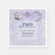 "Calling all Tiny Astronauts! Prepare for an out-of-this-world birthday bash with our charming space-themed napkin. Featuring a delightful rocket, planet, and the moon against a backdrop of twinkling stars, it's a stellar way to invite friends and family to celebrate your toddler's big day. Personalize it to make the event truly one-of-a-kind!"