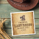 Chamando todos os cowboys para celebrar o último rodeio de seu amigo sulista. Um par de botas marrons de cowboy e um chapéu estão em cima de um guardanapo de festa em estilo pergaminho desbotado grunge para uma diversão e fantasia com seus amigos country western. Uma festa de despedida de solteiro temática do velho oeste.