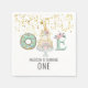 Primeiros guardanapos de papel de festa de aniversário do Unicórnio em estilo branco e bonito com brilho sujo de ouro, rosquinha, letra floral e bolo de unicórnio. Matizes cor-de-rosa, dourados e aqua para uma celebração mágica de festa de aniversário. Um fundo de aquarela macia. A parte de trás do convite em aqua pastel sólido.