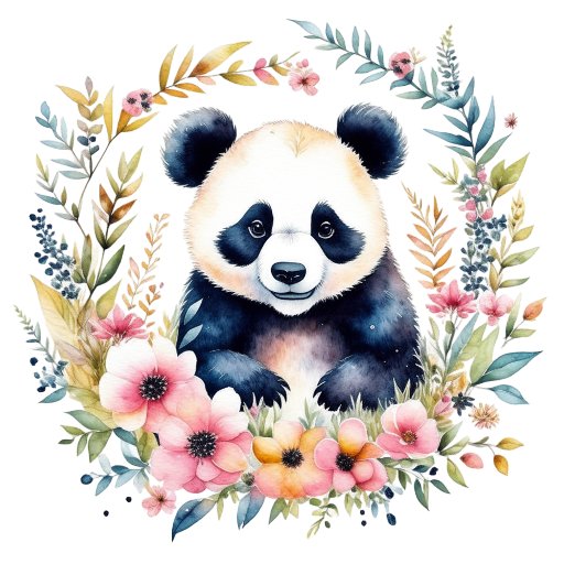 Um urso panda giro cercado por flores cor-de-rosa e laranja e pelos guardanapos personalizados festas de aniversário da menina ilustrados com folhagem verde.