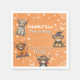 Bonitos guardanapos de festa de aniversário do Halloween com Moodifull escrito em uma fonte divertida e outros textos divertidos em branco cercados por estrelas, morcegos e teias de aranha em um fundo laranja. As lindas Vacas Highland estão vestidas com fantasias de Halloween em um fundo laranja. Há um lugar para personalizar o nome e o número de aniversário do seu filho.