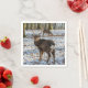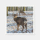 Veado vermelho selvagem em uma paisagem florestal com neve com o pano olhando diretamente para a câmera.
