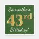 Este simples design de guardanapo de papel apresenta uma mensagem como "43º Aniversário de Samantha!", com o "43º" a ter uma aparência falsa de ouro, num fundo de cor verde. O nome pode ser personalizado. Pode ser usado em uma festa de aniversário para alguém que comemora seus quarenta e três anos. [~Z0000081]