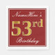 Este simples e elegante design de guardanapo de papel apresenta uma mensagem como "NameHere's 53rd Birthday" (com o "53º" a ter uma cor falsa em forma de ouro) dentro de uma área quadrada de cor vermelha com um contorno de fronteira simples. O nome está em um texto semelhante a script de cor branca e pode ser personalizado. Napkins como estes poderia talvez ser usado numa festa de aniversário para alguém que comemora seus cinquenta e três anos. [~Z0000138]