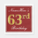 Este simples e elegante design de guardanapo de papel apresenta uma mensagem como "NameHere's 63rd Birthday" (com o "63º" a ter uma cor falsa em forma de ouro) dentro de uma área quadrada de cor vermelha com um contorno de fronteira simples. O nome está em um texto semelhante a script de cor branca e pode ser personalizado. Napkins como estes poderia talvez ser usado numa festa de aniversário para alguém que comemora seu sessenta e terceiro aniversário. [~Z0000138]