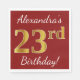 Este simples design de guardanapo de papel apresenta uma mensagem como "23º Aniversário de Alexandra!", com o "23º" a ter uma aparência falsa de ouro, num fundo de cor vermelha. O nome pode ser personalizado. Pode ser usado numa festa de aniversário para alguém que comemora seus vinte e três anos. [~Z0000080]