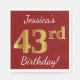Este simples design de guardanapo de papel apresenta uma mensagem como "43º Aniversário de Jessica!", com o "43º" a ter uma aparência falsa de ouro, num fundo de cor vermelha. O nome pode ser personalizado. Pode ser usado em uma festa de aniversário para alguém que comemora seus quarenta e três anos. [~Z0000080]