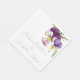 Estes guardanapos românticos apresentam um design floral. O fundo é um branco simples e elegante com violetas de aquarela roxas. Um delicado buquê de flores violetas é uma figura no canto superior direito, com os nomes do casal impresso abaixo.